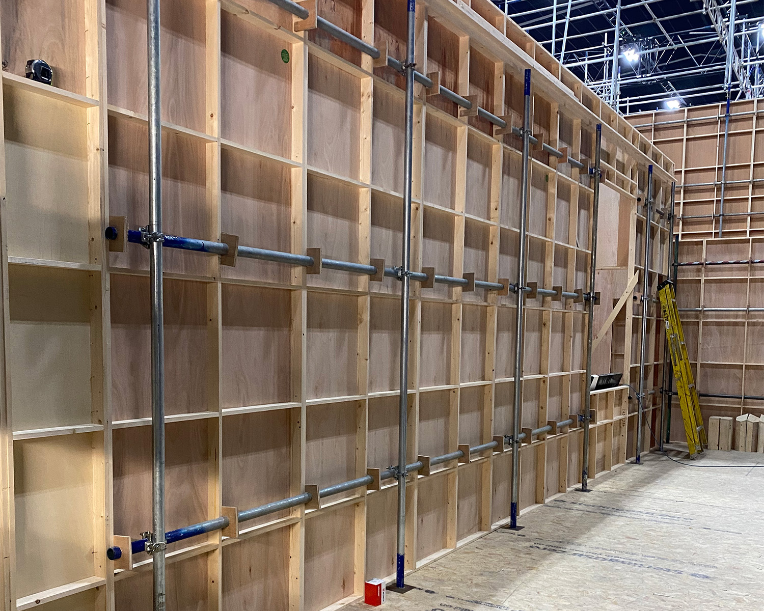 They are first braced with a number of horizontal scaffold tubes. U-Pad are used to slide over the scaffold tube and screw into the vertical timbers on the back of the flat.
